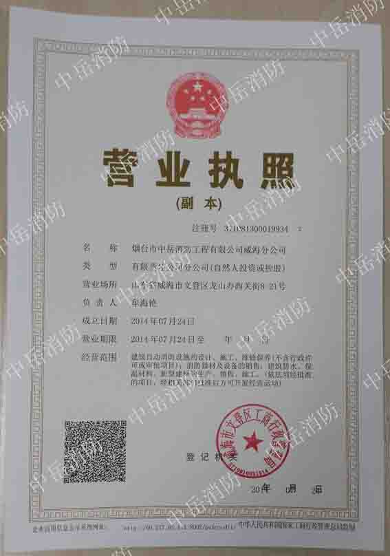 根據公司業務發展的需要,經公司總部研究決定,煙臺市中岳消防工程有限公司威海分公司于2014年7月24日正式成立。營業場所位于:山東省威海市文登區龍山辦西關街8-21號。